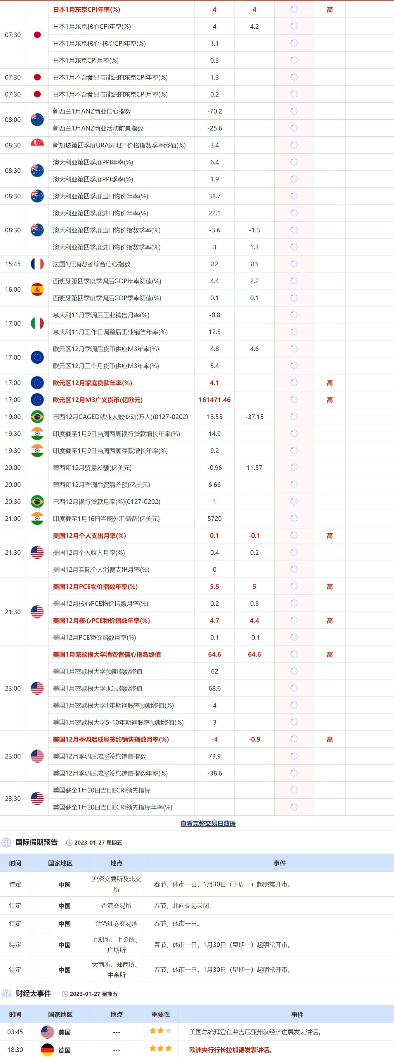 21:30 美国12月核心PCE物价指数年率(%) , 前值 4.7 , 预期值 4.4 , 公布值:待发布21:30 美国12月PCE物价指数月率(%) , 前值 0.1 , 预期值 -0.1 , 公布值:待发布