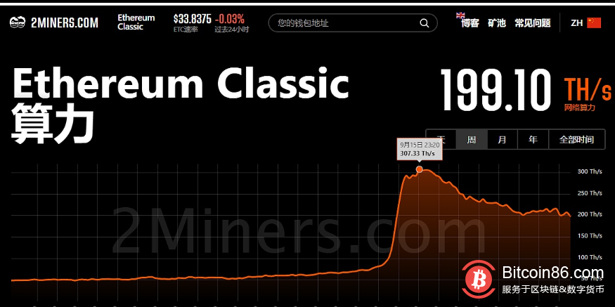 据2Miners数据显示,以太坊成功合并后,ETC全网算力本周算力于9月15日创下307.33TH/s,历史新高,但之后出现下滑,本文撰写时已跌至199.10 TH/s。
