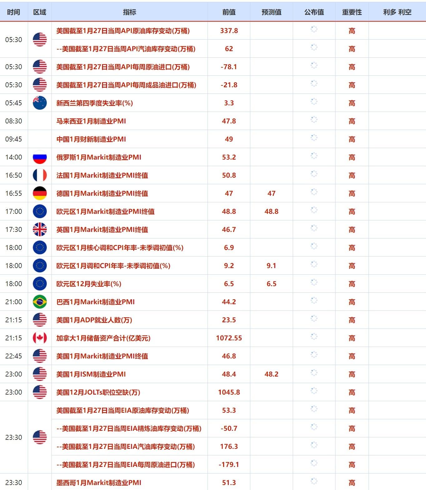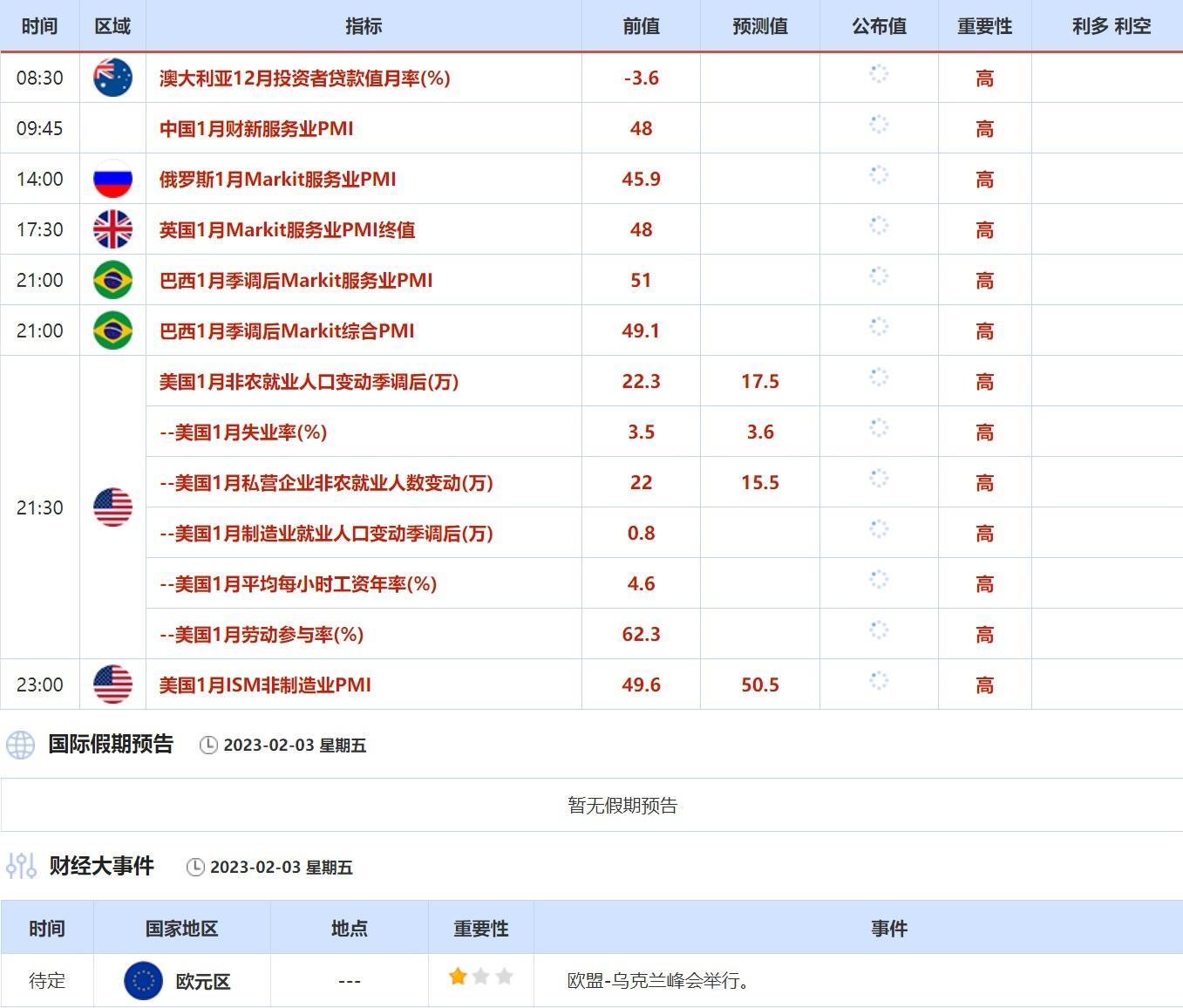 2月3日,美国将公布1月非农报告,目前市场预期美国1月非农增加17.5万人,低于22.3万人的前值,1月失业率为3.6%,略高于3.5%的前值。2月3日当天还将举行欧盟-乌克兰峰会,或影响未来市场走势,也需引起投资者关注。