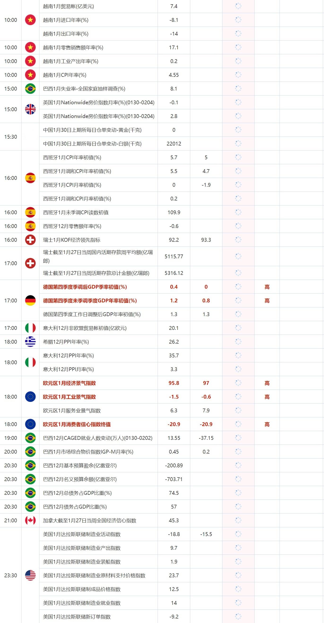 18:00 欧元区1月消费者信心指数终值 , 前值 -20.9 , 预期值 -20.9 , 公布值:待发布19:00 巴西12月CAGED就业人数变动(万人)(0130-0202) , 前值 13.55 , 预期值 -37.15 , 公布值:待发布