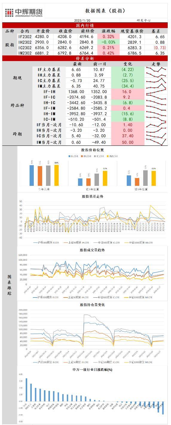 2、今日三大指数在外盘和春节消费回暖的影响下高开,但全天呈现震荡下行的趋势,沪指在开盘站上3300点,创业板指涨超1%。盘面表现来看,受到汽车行业政策利好延续以及特斯拉业绩超预期的刺激,汽车相关产业链全天维持强势;春节部分消费数据得到验证,消费板块内部出现分化。全天市场情绪较好,赚钱效应扩大,两市成交额时隔一个月重回万亿上方。北向资金继续维持年前大幅净流入的态势,单日净流入创2021年12月以来新高。海外市场方面,美国去年12月核心PCE同比增4.4%,连续第六个月放缓,同时1月密歇根大学调查显示消费者1年期通胀预期继续回落至3.9%,创下2021年4月以来新低,通胀预期边际改善使市场对美联储放缓加息的预期不断升温,成为上周美股反弹最主要的动力。本周FOMC会议即将召开,投资者预计美联储将降低加息幅度至25个基点。经济数据方面,美国四季度实际GDP初值为2.9%较三季度放缓,1月Markit制造业、服务业以及综合PMI虽较去年12月有所反弹但仍处于萎缩区间,其中制造业PMI连续7个月在50以下,美国经济放缓的迹象愈发明显。反观欧洲方面预期边际改善更加明显,1月欧元区综合PMI初值升至50.2,自2022年6月以来首次升至荣枯线上方,尽管欧央行行长拉加德向市场释放“鹰派”信号,表示在下次会议上将继续“大幅”加息,但随着天然气价格的下降,市场风险偏好抬升,欧洲市场获得较好表现。地缘局势方面,德美政策巨变,向乌克兰援助进攻性武器意味着未来战事恐将进一步升级,对市场风险偏好产生扰动。短期来看,春季假期接触性消费反弹幅度强于实物消费,如地产汽车,同时也是未来政策容易出现边际变化较大的领域,需紧跟政策的边际变化节奏。春节过后消费数据得到兑现,价值板块表现略弱于成长板块,国内经济复苏的背景下成长板块仍具备高景气且在政策的支持下未来有望迎来业绩反转。四大股指期货重心均上移至去年7月水平,IC和IM面临1月20日跳空高开缺口,IF和IH呈偏强震荡格局。申万一级31个行业中18个行业上涨,其中汽车行业领涨,商贸零售行业领跌。