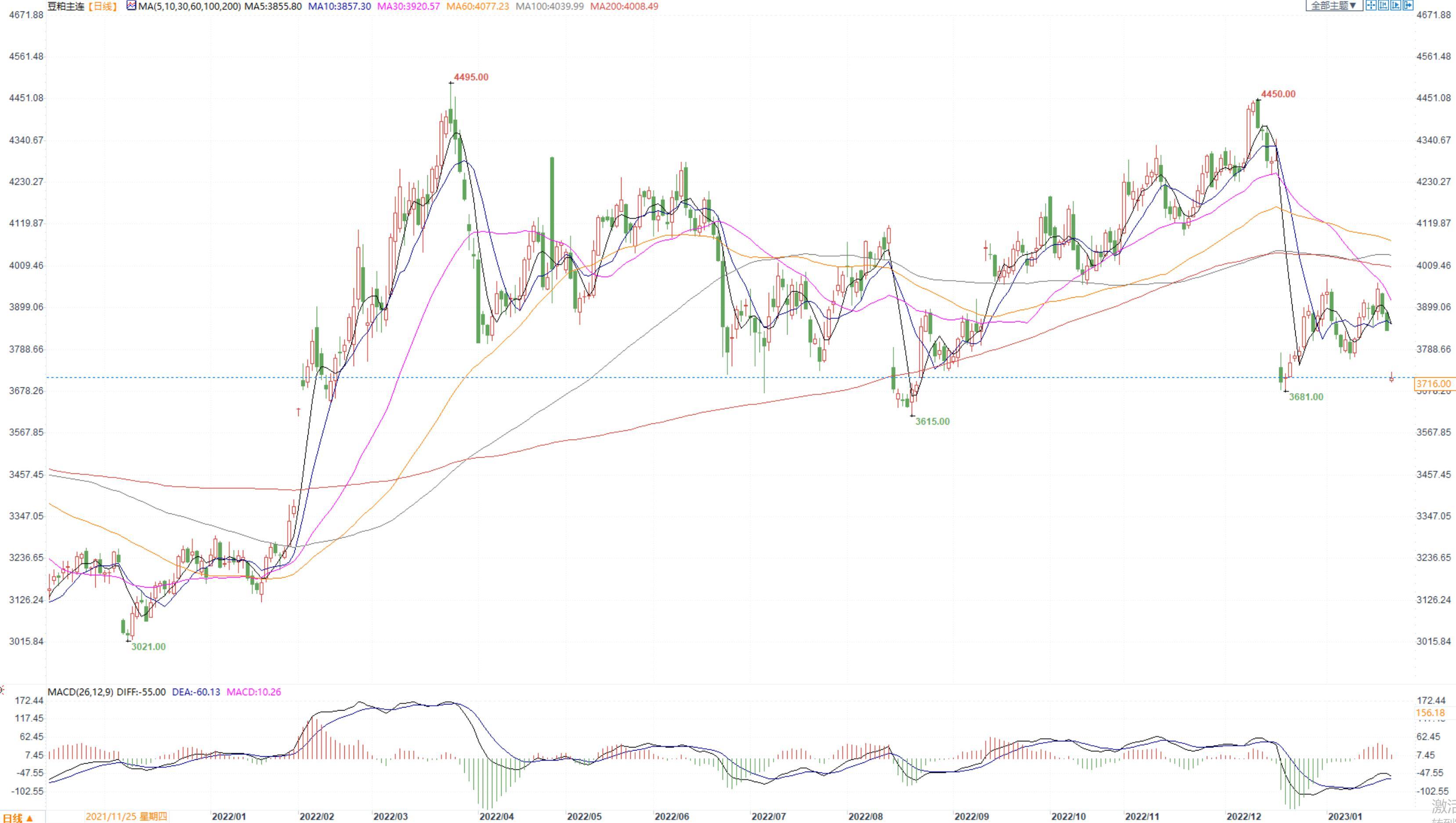 价格:今天是春节长假后的第一个交易日,黑色系板块开盘后冲高回落。螺纹钢2305合约上午一度涨至4273高位,之后震荡回落。收盘价4201元/吨,较节前最后一日结算价上涨25点,小幅收涨0.6%。现货市场表现相对较好,上海中天现货价4230元/吨,较昨日继续上涨50元/吨。