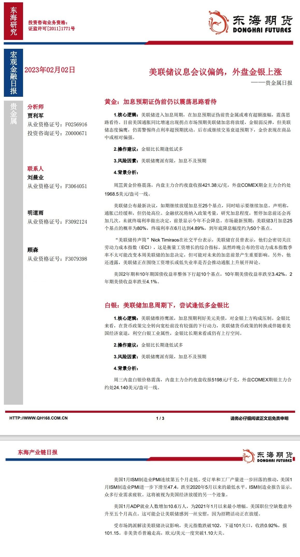 标题:【东海期货2月2日产业链日报】贵金属篇:美联储议息会议偏鸽,外盘金银上涨