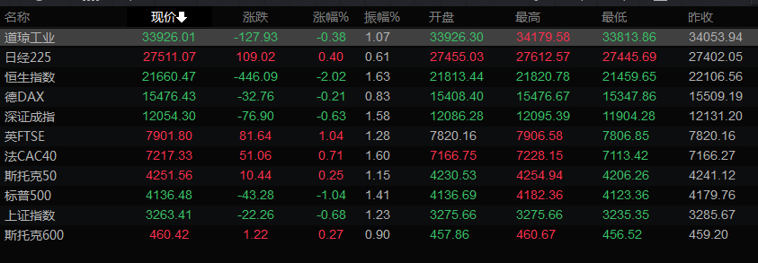 美股收盘情况:道琼斯工业指数下跌0.38%,至33926.01点;