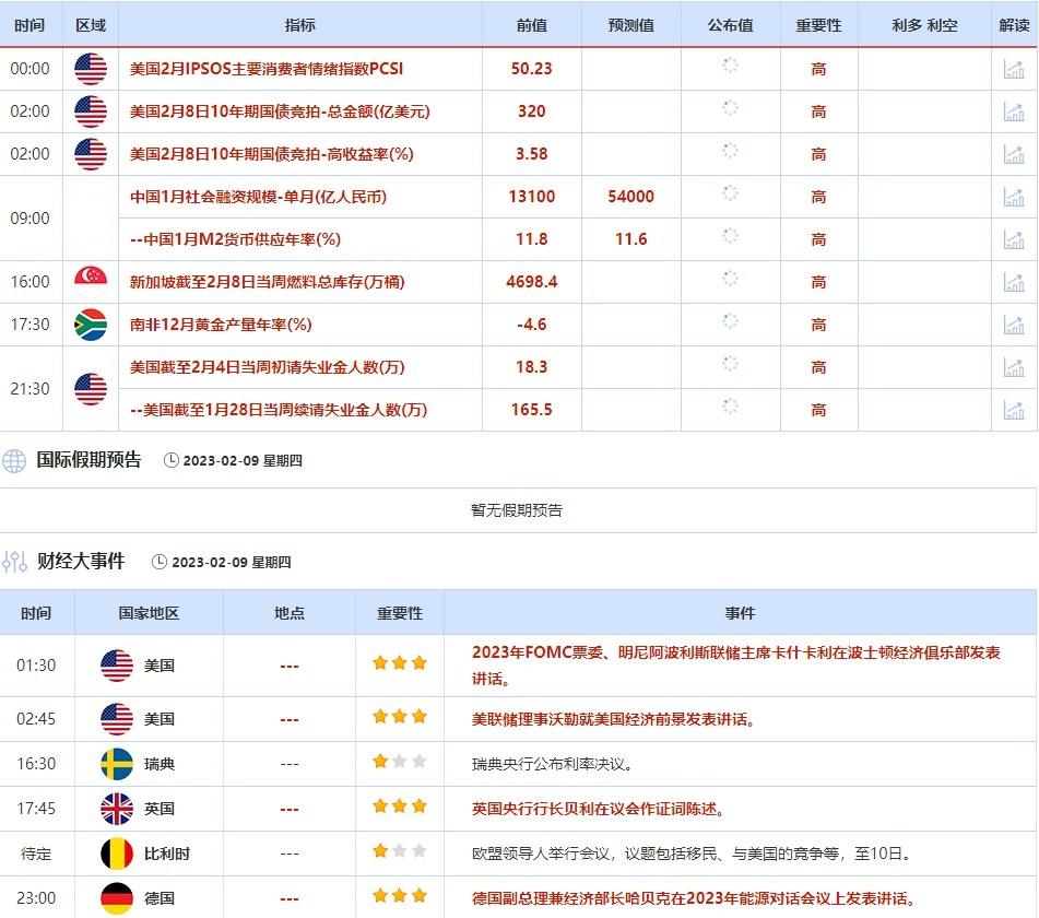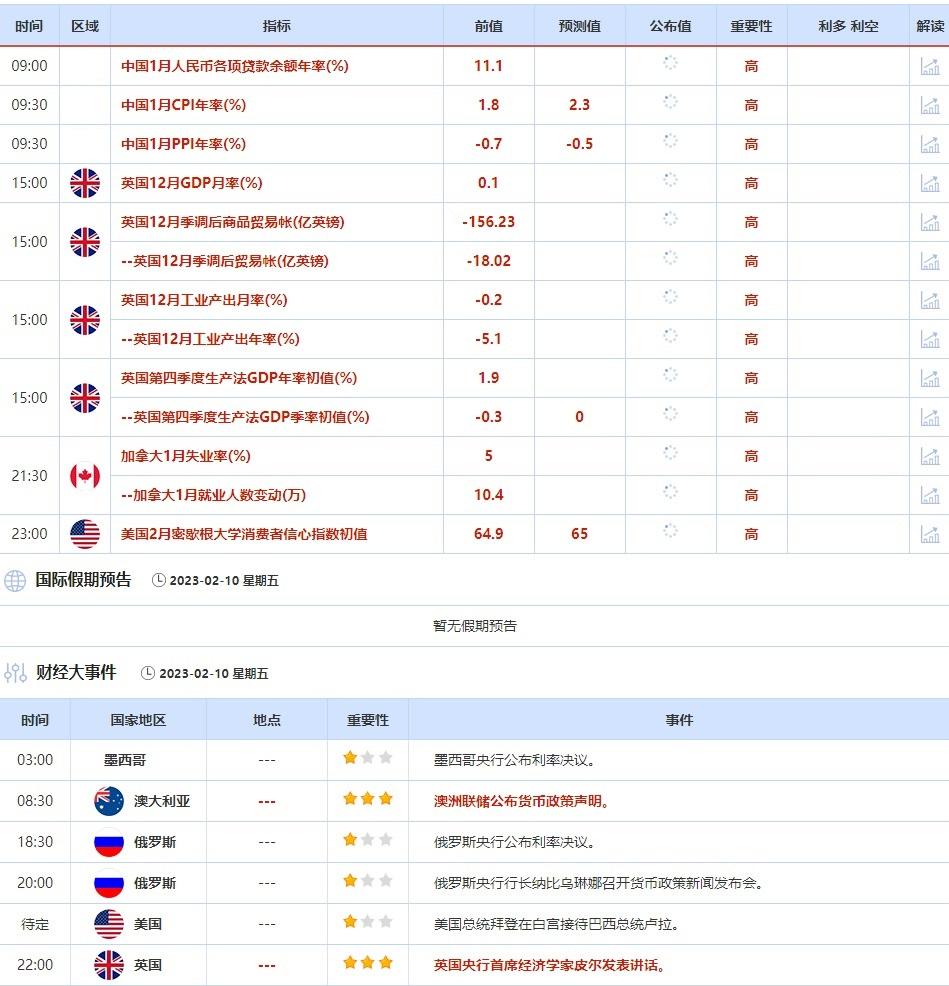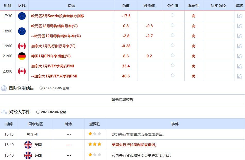 2月9日,美联储理事沃勒就美国经济前景发表讲话,德国副总理兼经济部长哈贝克在2023年能源对话会议上发表讲话,或影响市场走势,也需投资者保持关注。⑤2月10日(周五)关键字:澳洲联储公布货币政策声明,英国央行首席经济学家皮尔