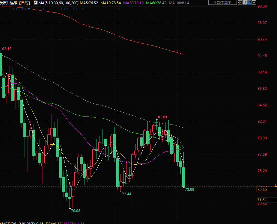 商品收盘情况:布伦特原油期货下跌2.7%,报每桶79.94美元;美国原油期货收跌3.3%,报73.39美元,美国期金结算价下跌2.8%至1876.6美元。