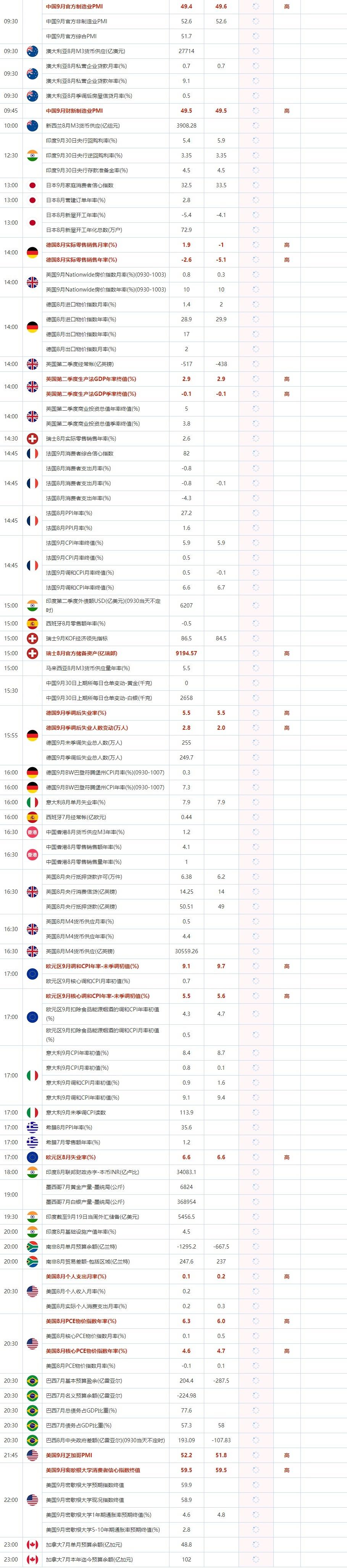 20:30 美国8月个人支出月率(%) , 前值 0.1 , 预期值 0.2 , 公布值:待发布20:30 美国8月个人收入月率(%) , 前值 0.2 , 预期值 -- , 公布值:待发布