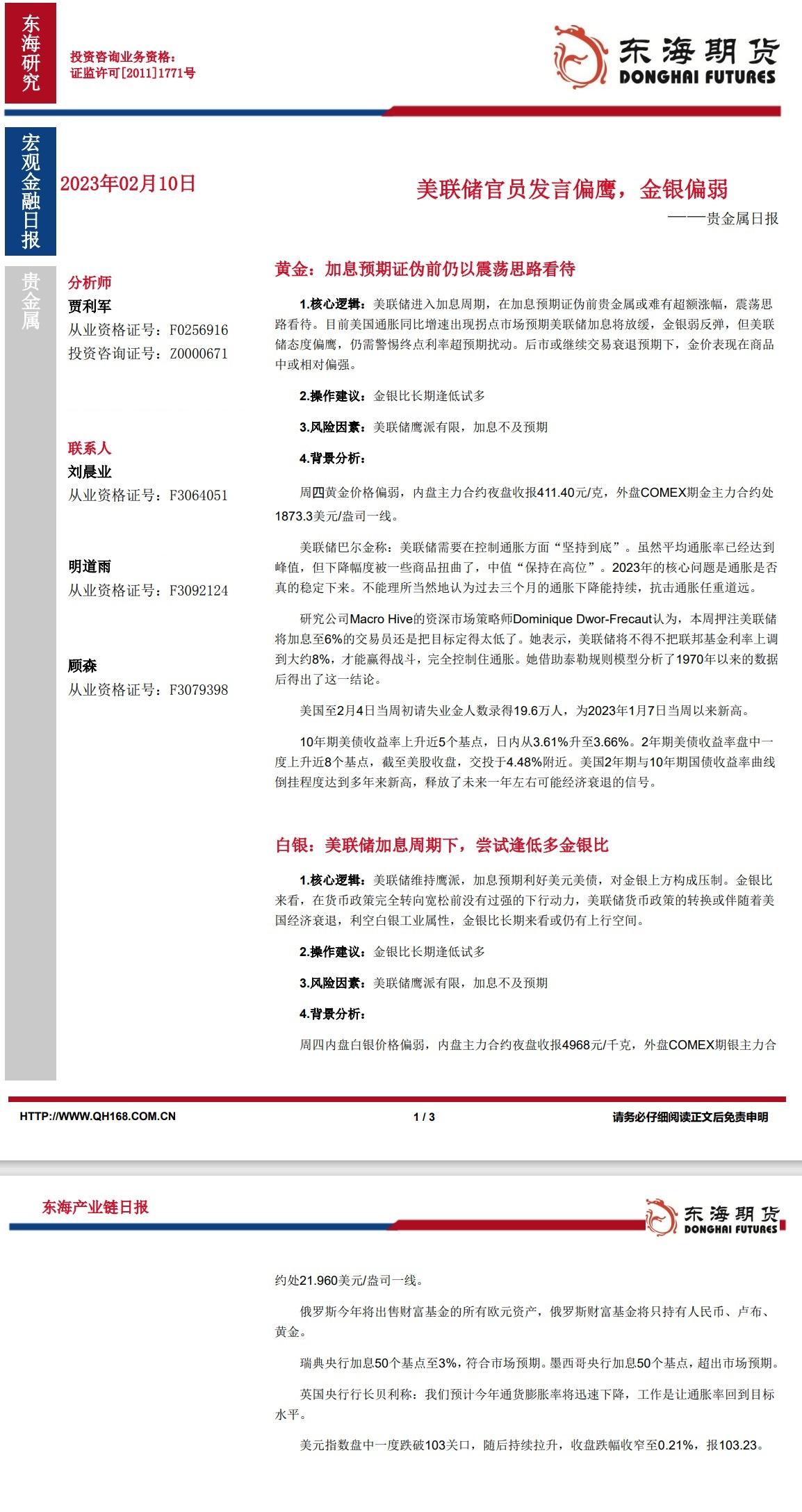 标题:【东海期货2月10日产业链日报】贵金属篇:美联储官员发言偏鹰,金银偏弱
