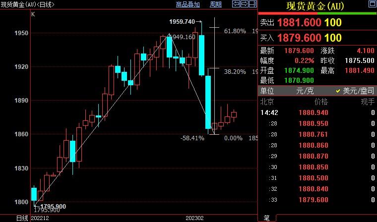 现货黄金上涨0.37%至1882.33美元/盎司;COMEX期金主力合约上涨0.17%至1893.9美元/盎司;