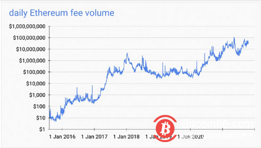 看看以太坊的历史数据就知道了。事实上,自创世以来,以太坊网络已经扩展了约50倍,而总交易费用已经扩大到每年数十亿美元。我们具体看一下。