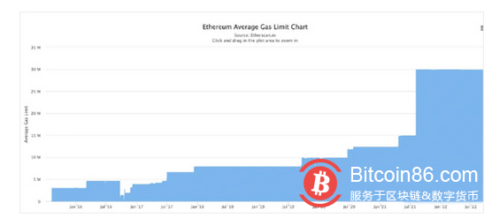 在创世时,区块gas限制被设置为300万gas(以太坊交易在一个区块中可以消耗的最大gas)。至撰写本文时,每个区块的平均gas消耗量为1500万gas。可扩展性已经增加了5倍。