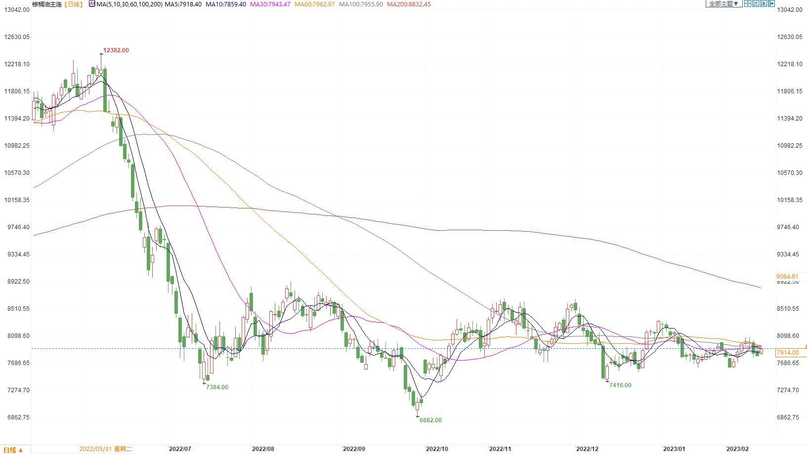 棕榈油2305合约日内涨0.38%,收盘7914元/吨。