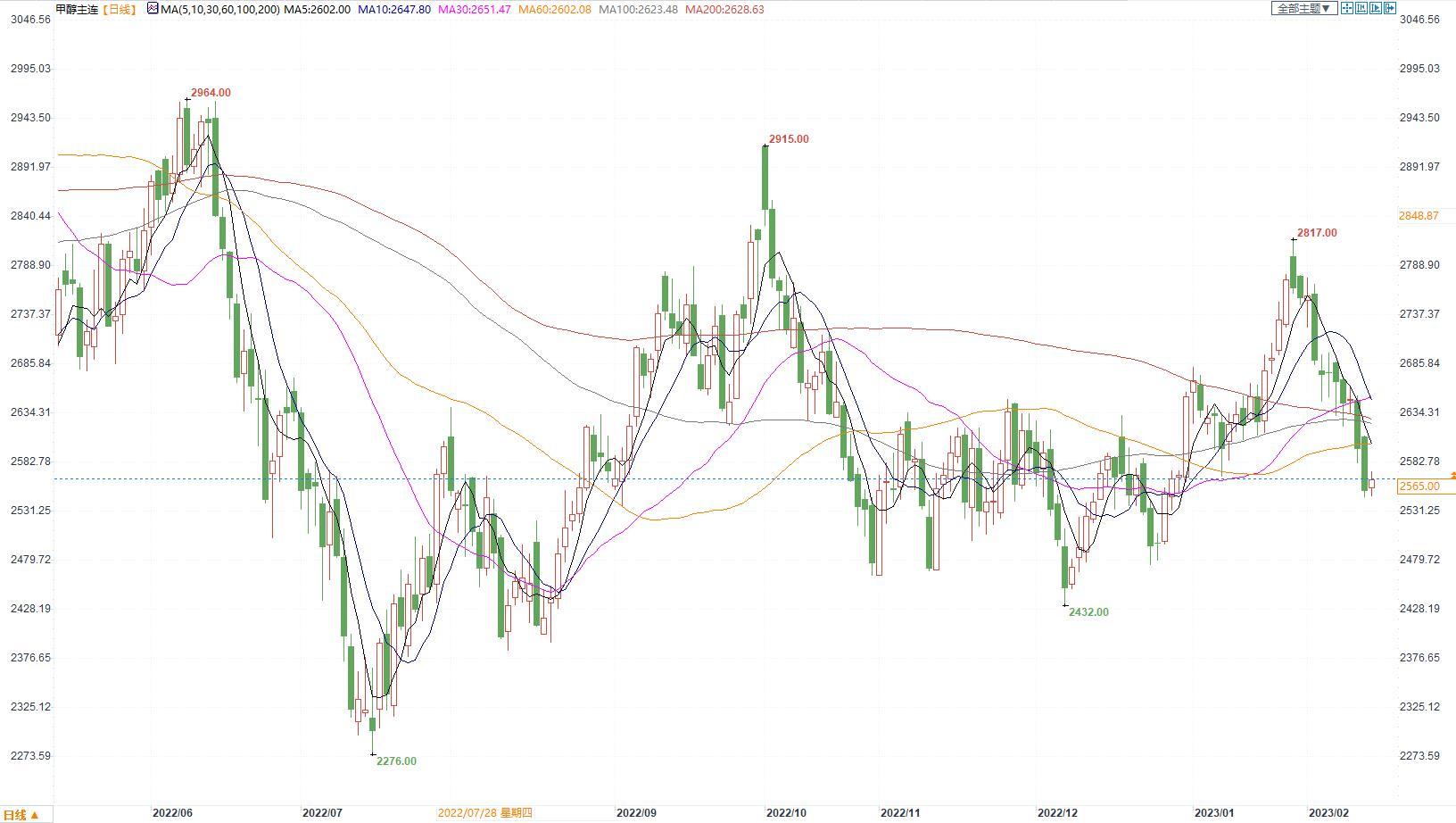 期货市场,甲醇2305合约小幅收涨,收盘价2565。张家港地区参考价格2700-2710元/吨附近现汇出罐。