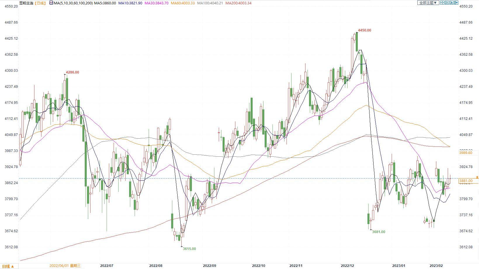 豆粕2305合约日内跌0.10%,收盘价3881元/吨。