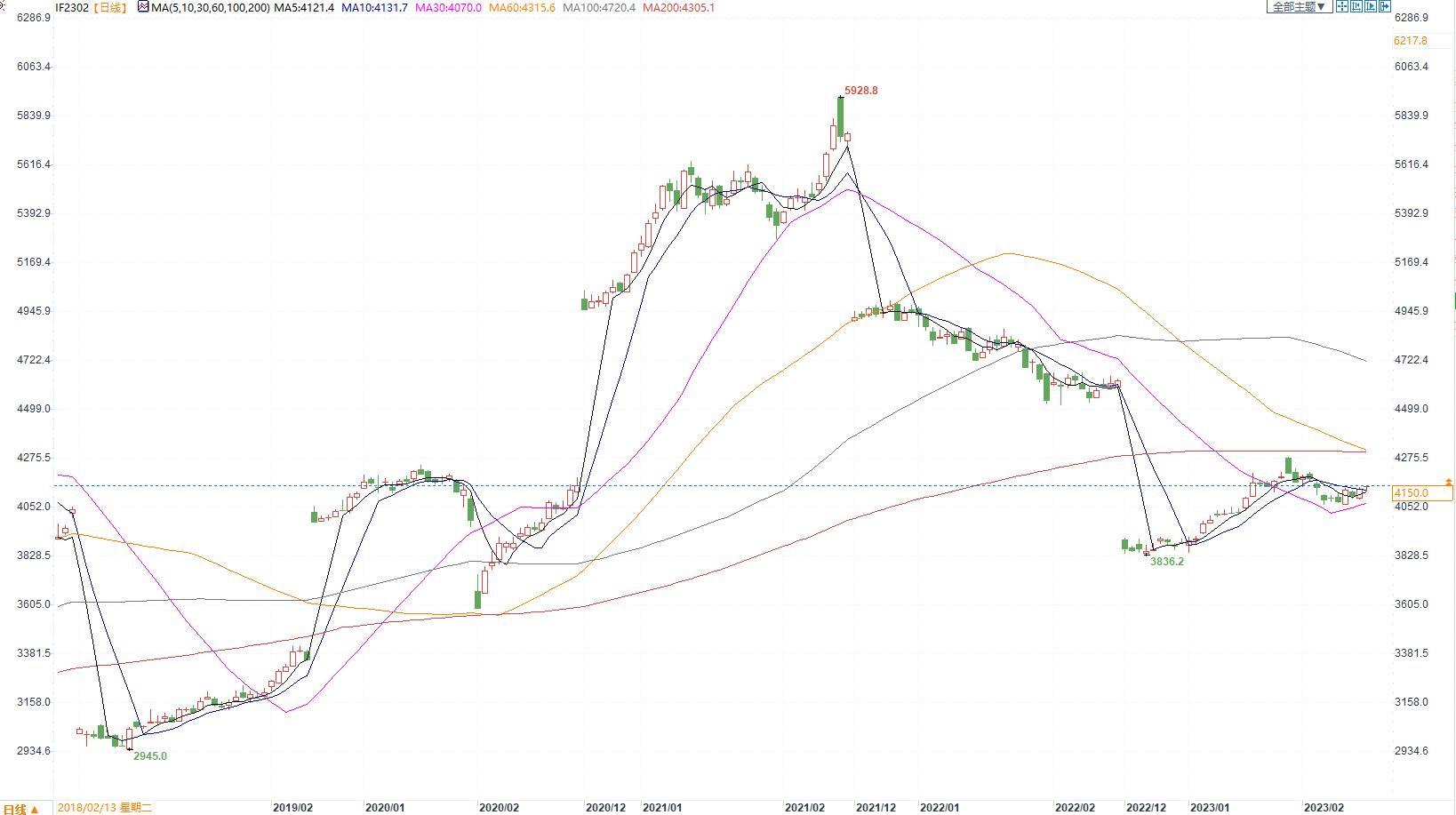 【今日涨跌】四大期指全线收涨。IH2302收盘价为2780.2,收涨0.48%;IF2302收盘价为4150,收涨0.29%;IC2302收盘价为6395.8,收涨0.43%;IM2302收盘价为7055.6,收涨0.34%。