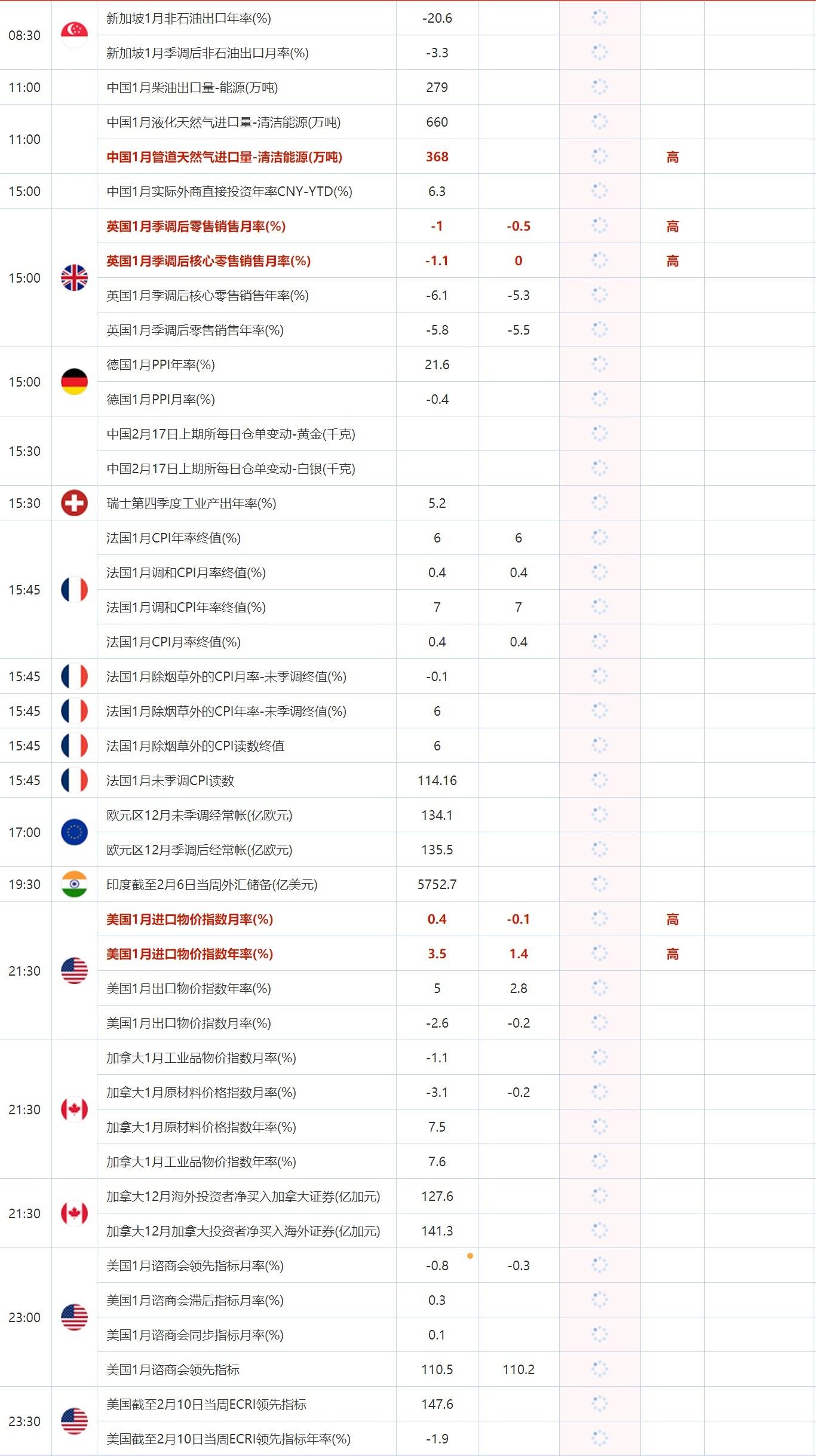 15:00 英国1月季调后核心零售销售月率(%) , 前值 -1.1 , 预期值 0 , 公布值:待发布15:00 英国1月季调后核心零售销售年率(%) , 前值 -6.1 , 预期值 -5.3 , 公布值:待发布