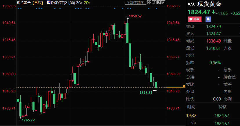 现货黄金下跌2.18%至1824.49美元/盎司;COMEX期金主力合约下跌2.29%至1833.5美元/盎司;