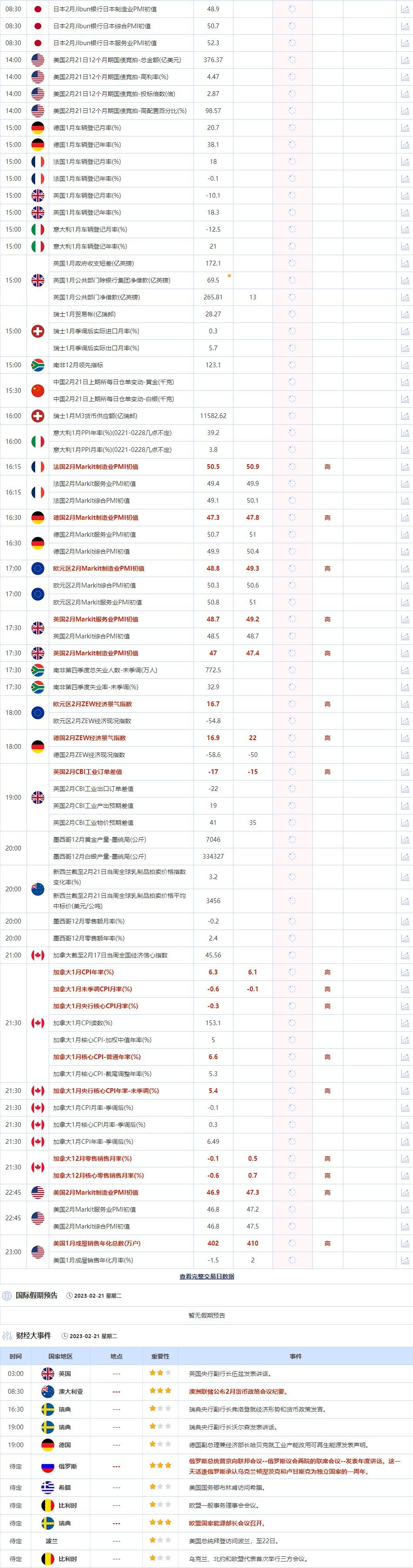 21:30 加拿大12月核心零售销售月率(%) , 前值 -0.6 , 预期值 0.7 , 公布值:待发布22:45 美国2月Markit制造业PMI初值 , 前值 46.9 , 预期值 47.3 , 公布值:待发布22:45 美国2月Markit服务业PMI初值 , 前值 46.8 , 预期值 47.2 , 公布值:待发布