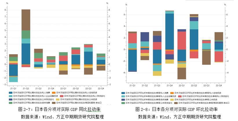 剔除通胀因素,2022年四季度日本实际GDP录得136.88万亿日元,同比增长0.6%,实现连续7个季度同比正增长,但同时也是近7季度同比增速最为缓慢的;环比增长0.2%,继续保持从2020年四季度以来隔季环比正增长的规律。