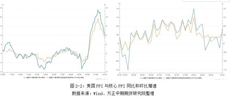 同样,美国1月PPI也出现“同比回落、环比走强”的走势。美国PPI同比增速在2022年中已现拐点,2023年1月美国PPI和核心PPI同比增速进一步回落至6%和5.4%。不过,美国PPI和核心PPI环比增速分别录得0.7%和0.5%,均高于前值-0.2%和0.3%。