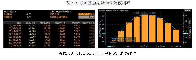 虽然通胀边际略有走强,但今年美国CPI同比增速震荡下行的总体趋势并未改变,毕竟全球处于经济增速放缓和供应链压力缓解。但是,随着中国经济回暖预期增强、俄罗斯石油减产、美国住房市场强势、俄乌冲突升级以及住宅CPI比重提升,美国通胀的回落速度会有所放缓,个别月份甚至会有所反弹。2022年12月美国PCE核心通胀率录得4.4%,与美联储2%的长期通胀率相去甚远,叠加2023年1月通胀边际增强,导致市场提升了美联储此轮加息终点预期。根据联邦基金期货隐含隔夜利率显示,此轮加息终点将为5.25%。