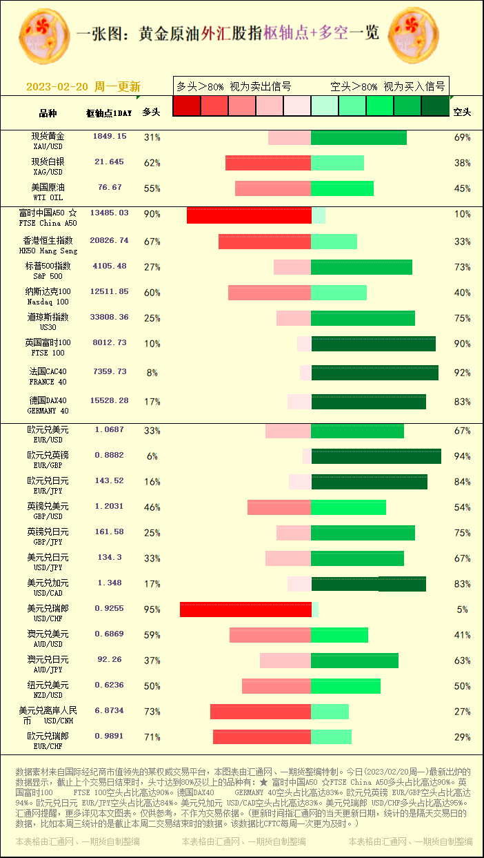 一张图:黄金原油外汇股指"枢纽点+多空占比"一览(2023/02/20周一)