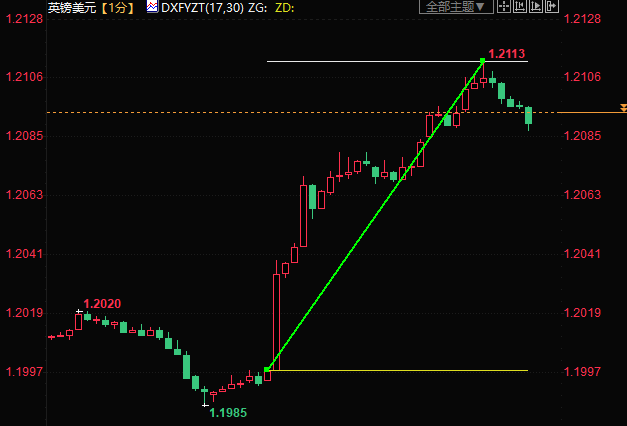 数据公布后的30分钟内,英镑兑美元蹿升近115点至1.2113,美元指数从日内高位103.27快速回落。