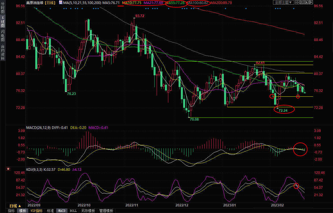震荡;MACD轻微死叉,KDJ死叉,油价周二再次反弹受阻,并继续承压于所有均线下方,5日均线下穿55日均线结成死叉,在顶破55日均线77.28前,油价短线偏向震荡下行,初步支撑在上周五低点75.05附近,如果失守该,则增加短线看空信号,布林线下轨支撑目前在73.94附近,强支撑在2月7日低点72.24附近,短线下破难度较大。