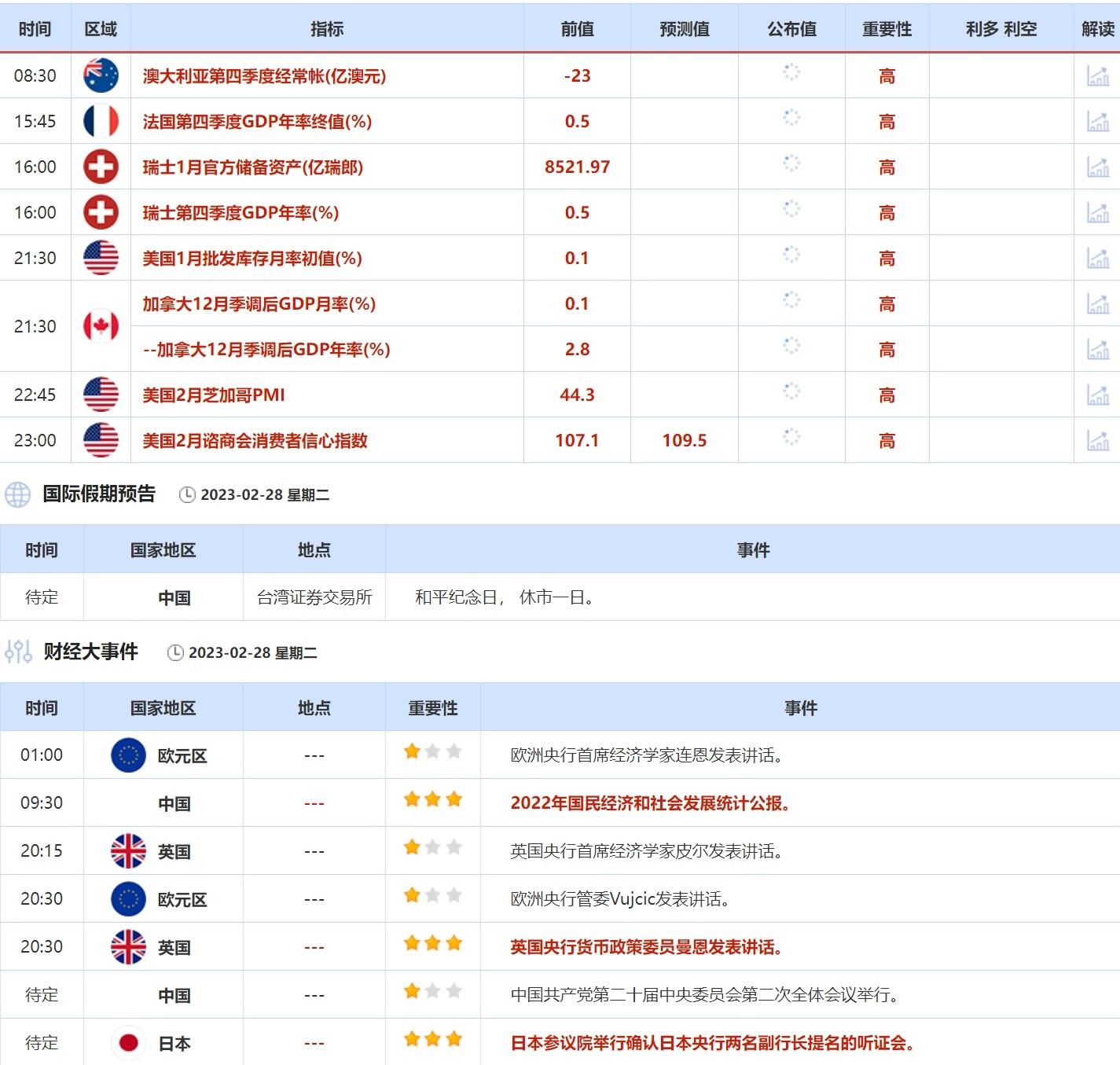 2月28日当天,中国台湾证券交易所因和平纪念日,休市一日。此外,中国将发布2022年国民经济和社会发展统计公报,英国央行货币政策委员曼恩发表讲话,日本参议院举行确认日本央行两名副行长提名的听证会,也需引起重视。