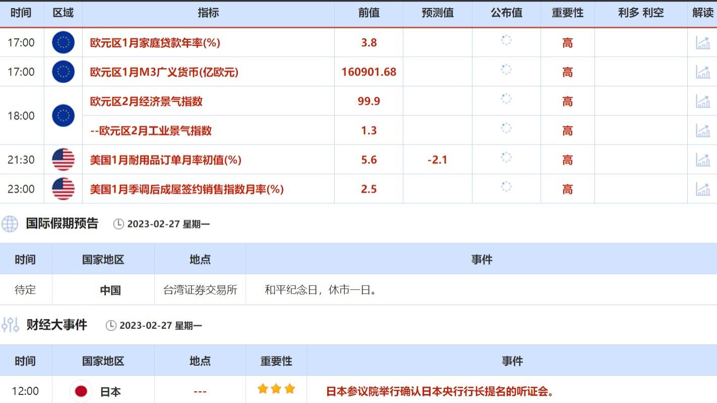 ①2月27日(周一)关键字:欧元区2月经济景气指数,美国1月耐用品订单,日本央行行长提名的听证会