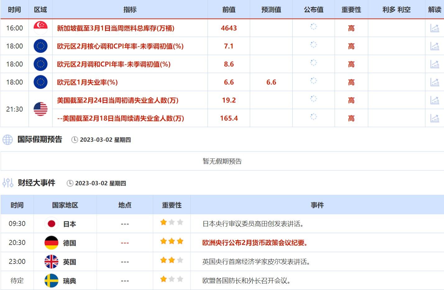 此外,芝加哥联储主席古尔斯比发表讲话,英国央行行长贝利就生活危机成本发表讲话,也是当天需要关注的焦点。④3月2日(周四)关键字:欧元区1月失业率, 美国截至2月24日当周初请失业金人数,欧洲央行2月货币政策会议纪要