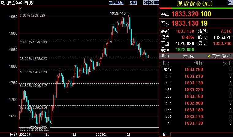 现货黄金下跌0.01%至1825.07美元/盎司;COMEX期金主力合约下跌0.48%至1832.7美元/盎司;