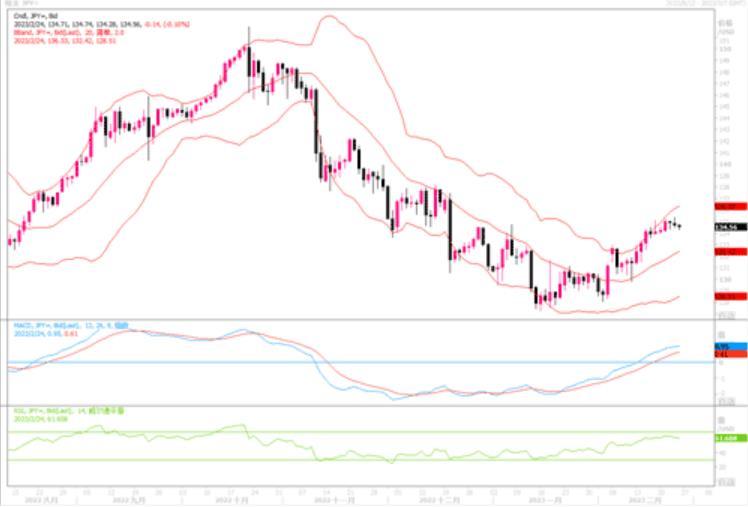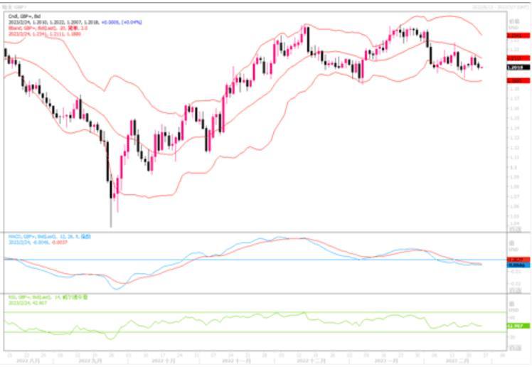 继续回落0.22%,报1.2017美元,盘中一度跌穿1.20。英国央行货币政策委员会(MPC)委员曼恩表示,现在说去年通胀激增带来的风险已经缓解还为时过早,央行应该继续提高借款成本。但由于其观点并不新鲜,英镑并未得到提振。本周早些时候的PMI调查发出了积极的经济信号,提高了英国央行3月再次加息的可能性。但是,近期积极的经济指标又凸显了英国央行的棘手任务:在降低通胀的同时,如何避免英国经济进一步下滑。因此,利率期货市场上对于英镑的利率定价,其继续上调的空间已变得不大,甚至或会早于美联储停止加息。可以说,近期在加息这方面的角力来说,英镑似乎开始处于下风。日线图上