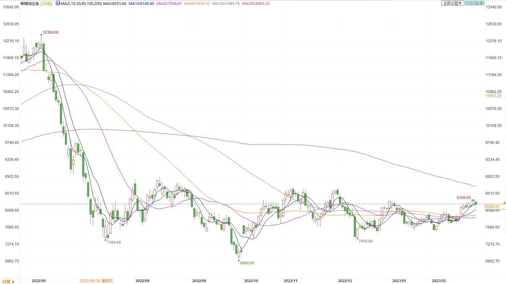 棕榈油2305合约日内跌0.27%,收盘8260元/吨,广州市场棕榈油8230元/吨。