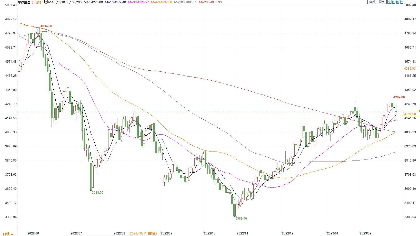 价格:螺纹钢2305合约今日整体宽幅震荡。受唐山等地烧结限产的影响,早盘开盘后一度冲高回升,之后再次走弱,收盘价4191元/吨,收跌0.64%。上海中天现货价4260元/吨,较上周五价格暂稳。