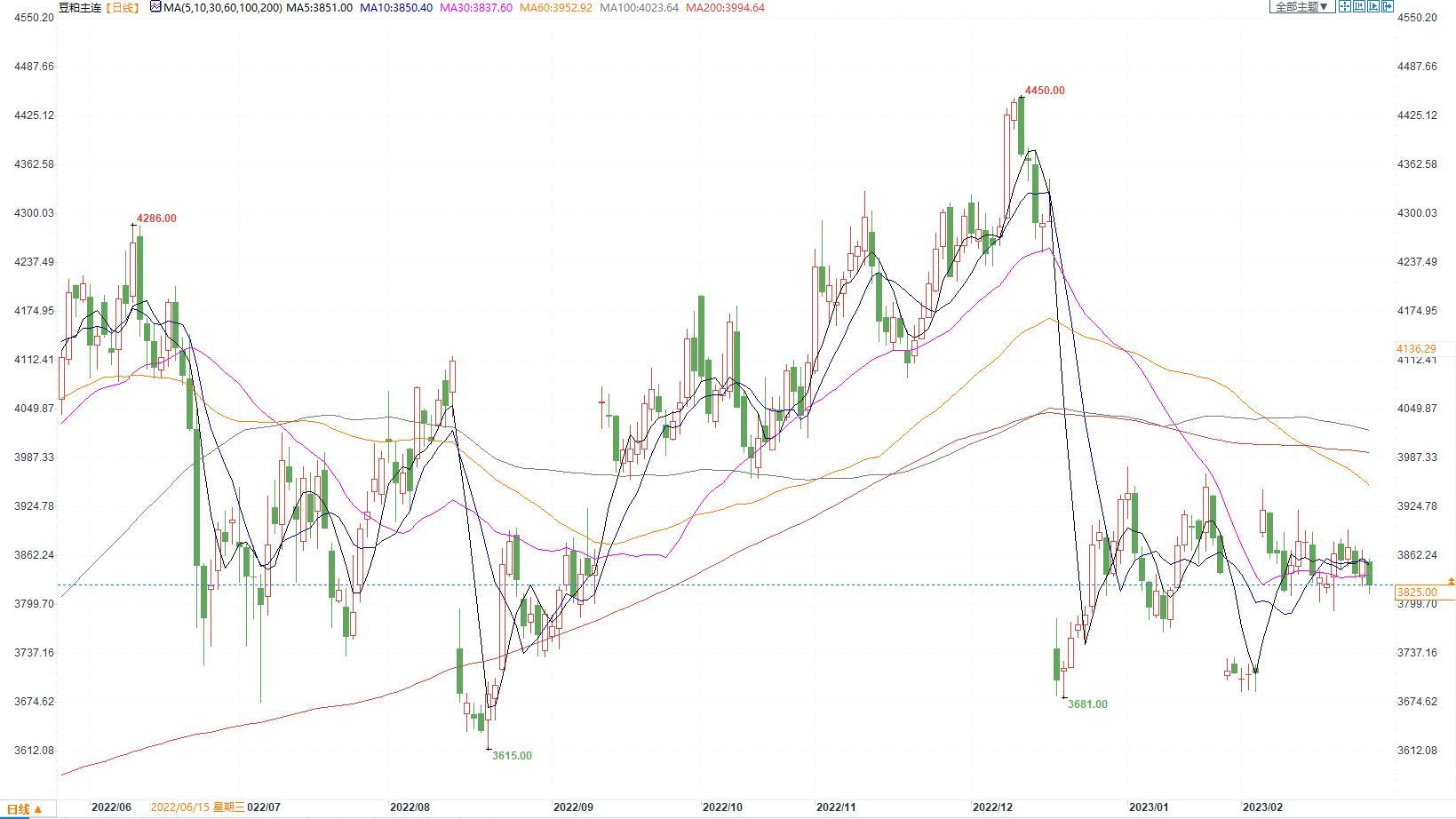 豆粕2305合约日内跌0.62%,收盘价3825元/吨,张家港市场豆粕4375元/吨。