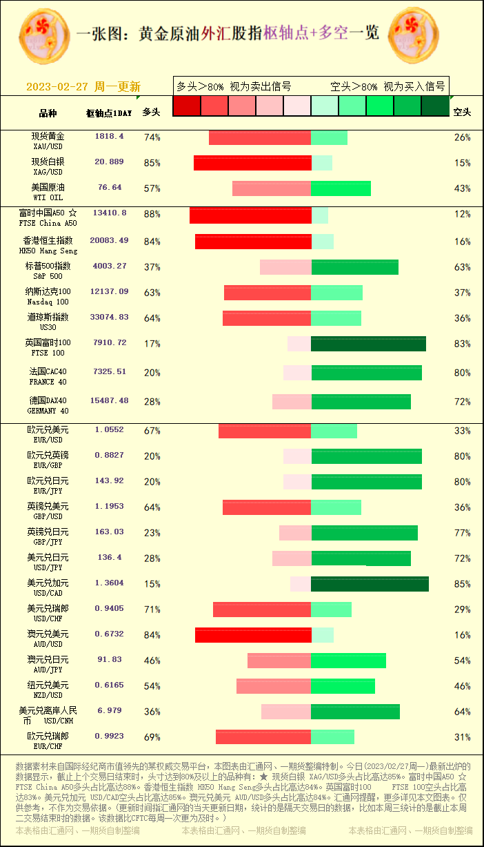 一张图:黄金原油外汇股指"枢纽点+多空占比"一览(2023/02/27周一)
