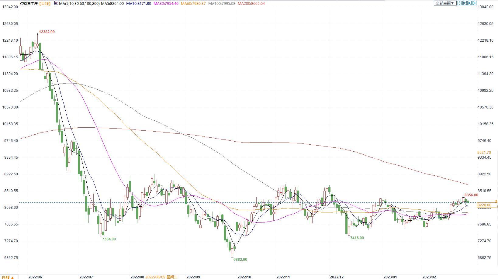 棕榈油2305合约日内跌0.51%,收盘8228元/吨,广州市场棕榈油8190元/吨。