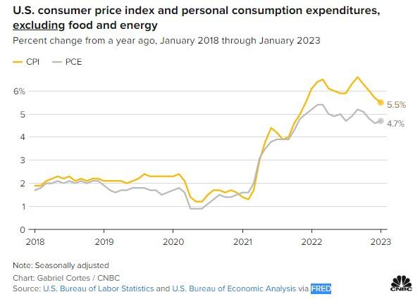 图1:经过季调的美国CPI和PCE(不计食品和能源)同比百分比(2018年1月始至2023年1月末)