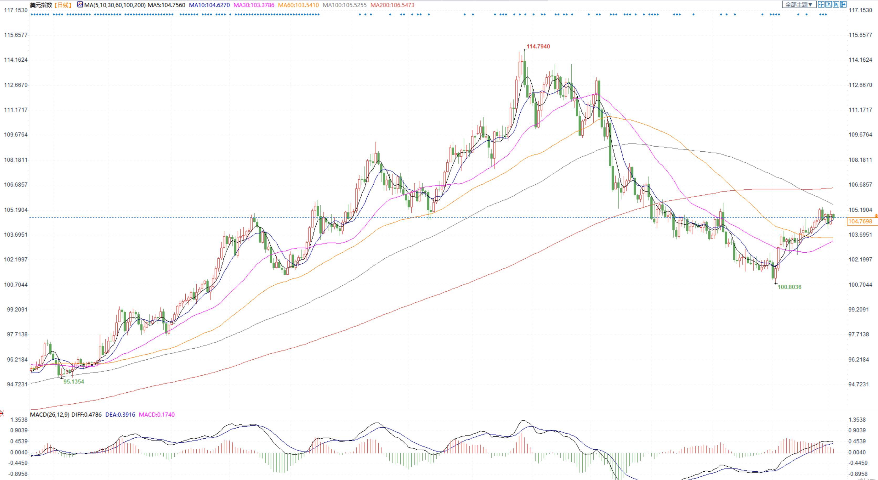 美元指数震荡回落,中国经济复苏,美国经济衰退升温施压美元,而美联储鹰派基调始终支持美元。