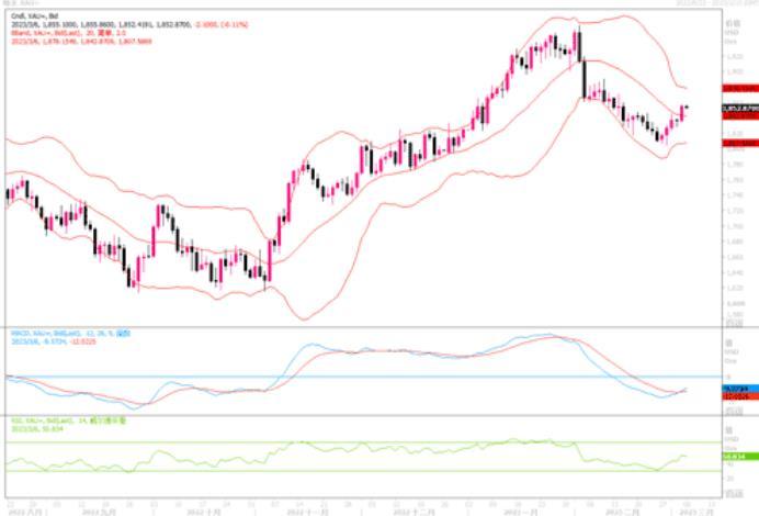 技术层面上,黄金上周是一个震荡上行的走势,上周五美盘尾盘时段价格最高至1856一线,日线收一根小阳柱,布林带缩口,KDJ指标金叉放量,MACD指标即将形成金叉,价格处于下行通道中的波浪上行走势。本周上方关注1860/1870/1893的压力情况,下方则关注1848/1827/1804这些点位的支撑情况。