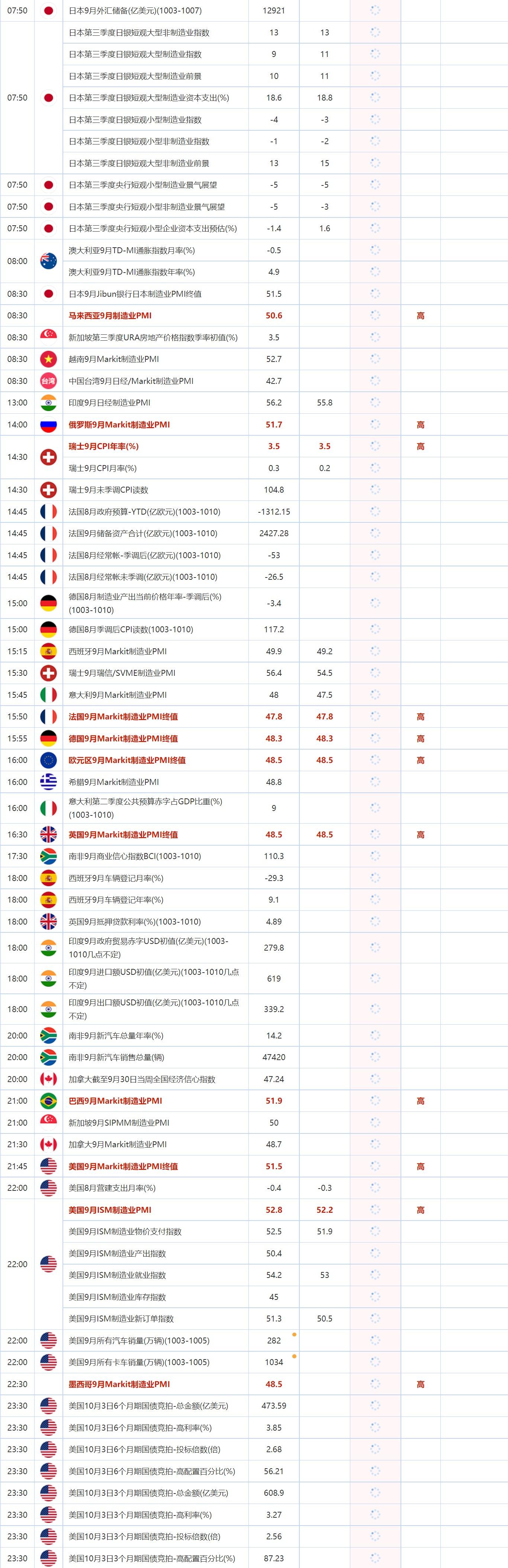 16:30 英国9月Markit制造业PMI终值 , 前值 48.5 , 预期值 48.5 , 公布值:待发布17:30 南非9月商业信心指数BCI(1003-1010) , 前值 110.3 , 预期值 -- , 公布值:待发布