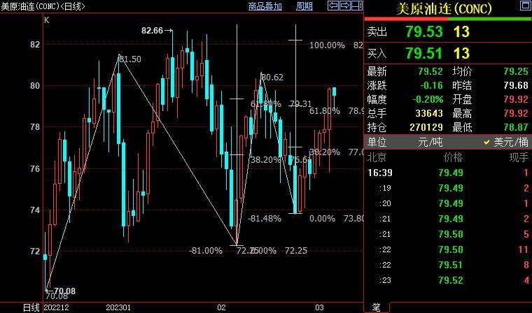 周一(3月6日),国际油价下跌,技术面存在修正需求,且谨慎的投资者等待美联储主席鲍威尔本周稍后即将发表的证词。但技术面依然看涨,NYMEX原油后市上看80.95美元。