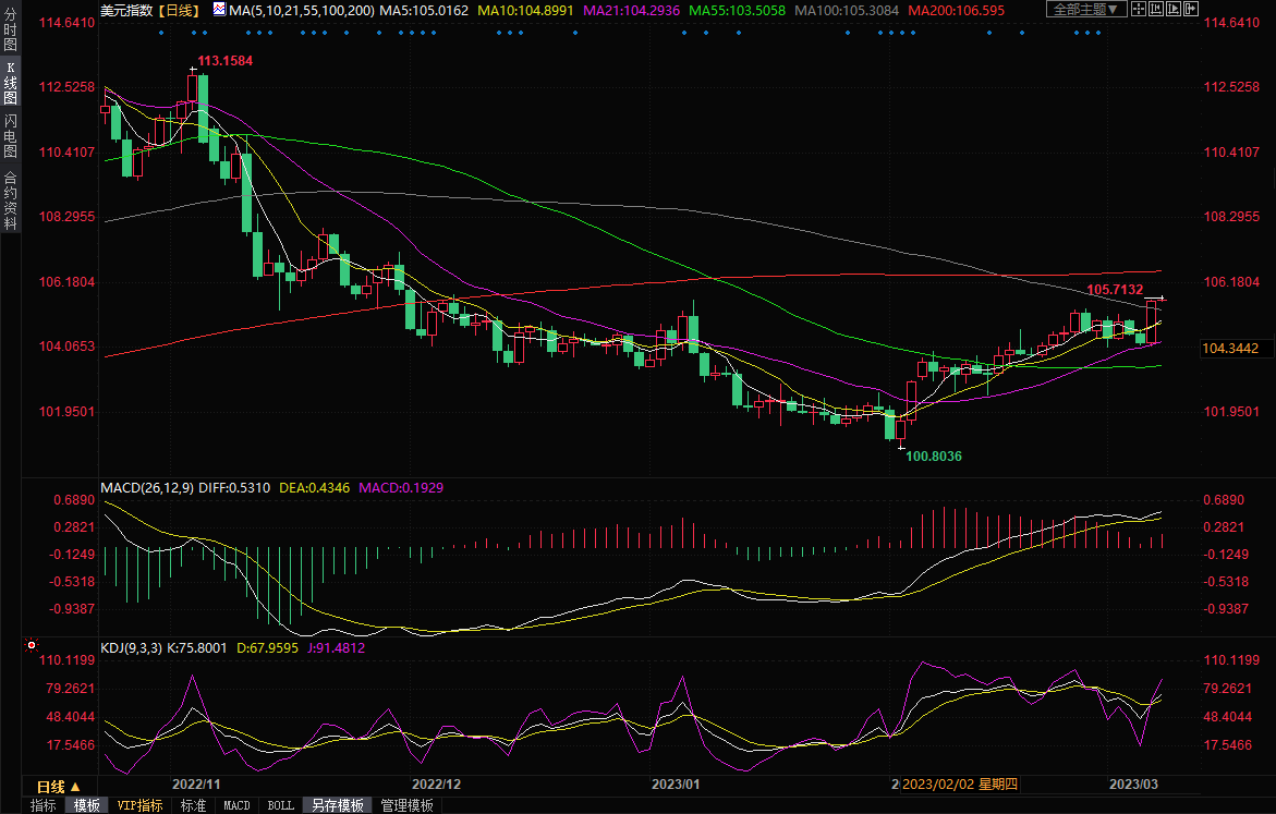 美元指数周二大涨1.31%,录得9月23日以来最大单日涨幅,因此前美联储主席鲍威尔国会证词意外非常“鹰派”,提高了市场对美联储3月份加息50个基点的预期和美联储更高终端利率的预期。