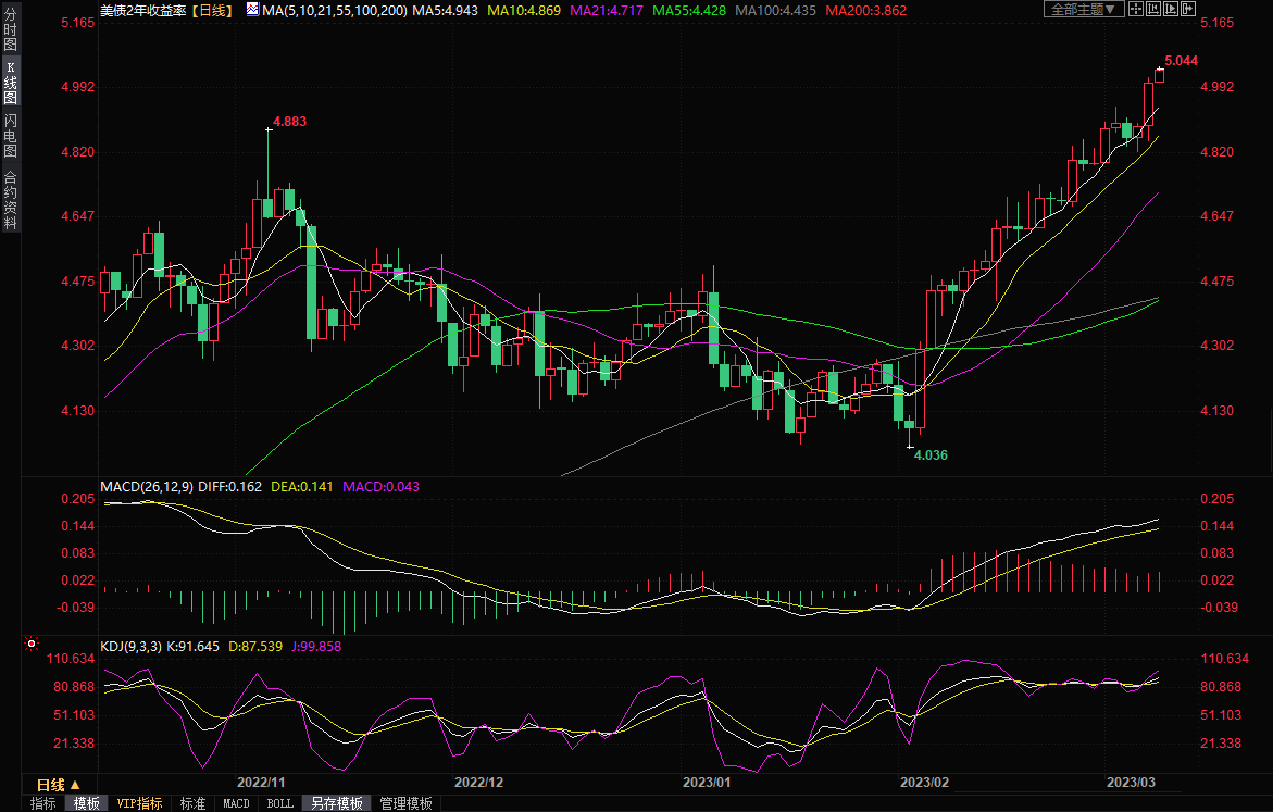 美债两年期收益率跳升至5%上方,刷新2007年以来高点