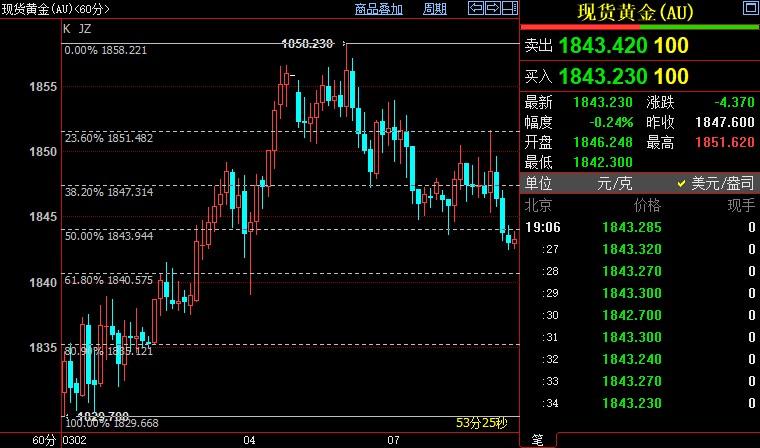 现货黄金下跌0.25%至1842.08美元/盎司;COMEX期金主力合约下跌0.40%至1847.2美元/盎司;