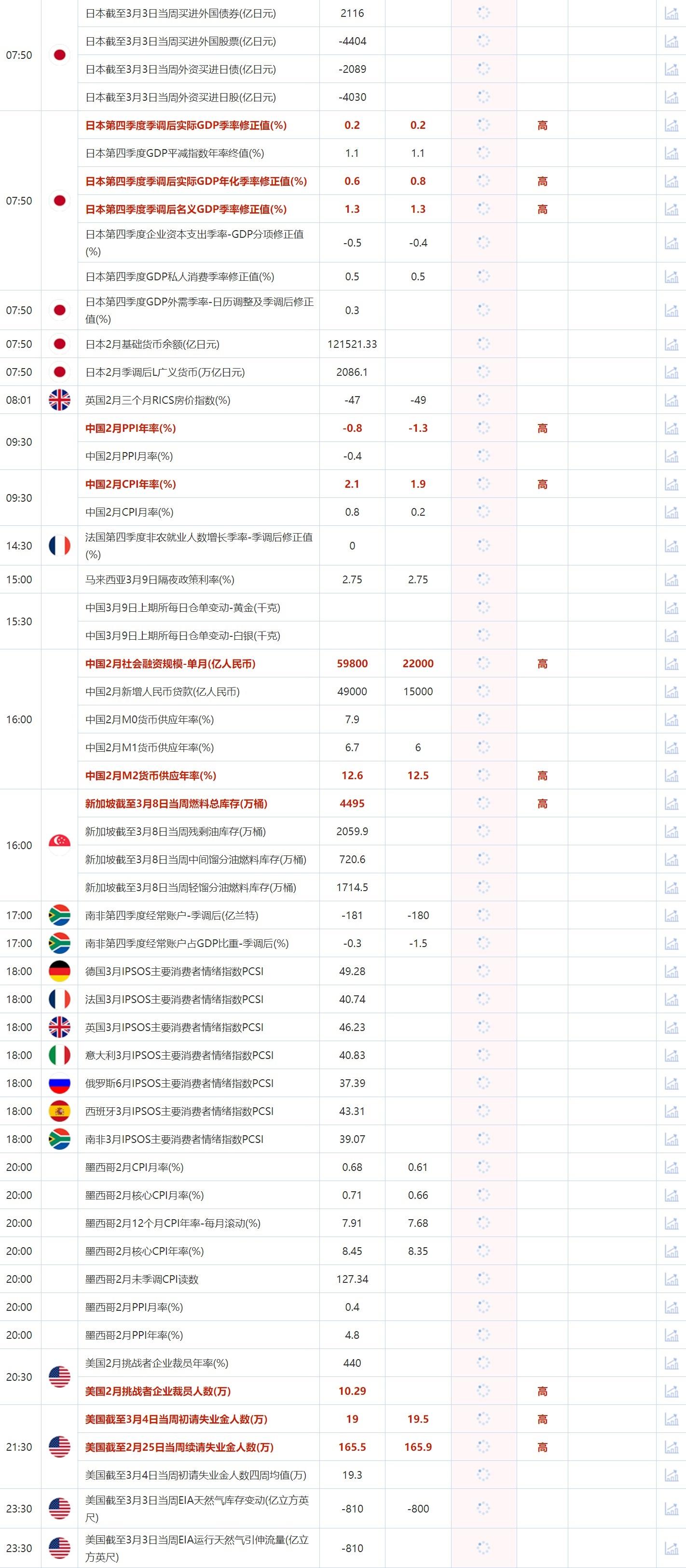 后续及时更新的财历数据请关注:【汇通网3月9日财经日历】