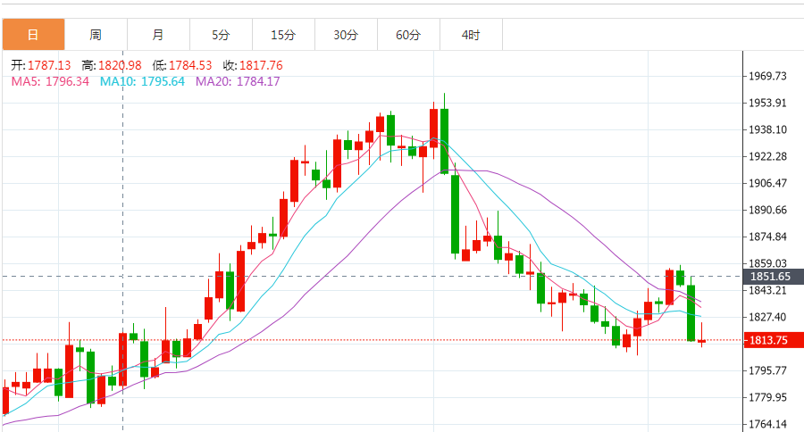 现货金几乎持平于每盎司1813.85美元,此前曾触及2月28日以来最低的1809.27美元。
