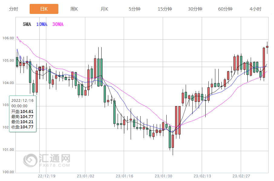 美元指数尾盘持平于105.63,早些时候达到105.88,为12月1日以来最高。它从2月1日的九个月低点100.80上升,但仍远低于9月28日达到的20年高点114.78。
