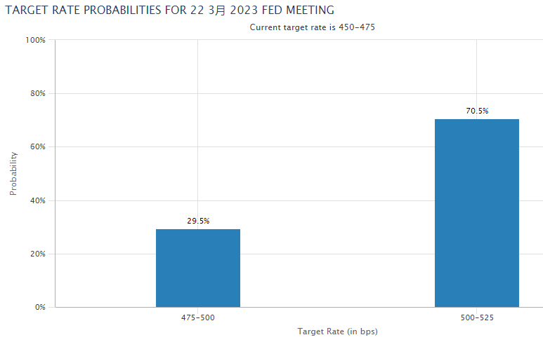 在去年持续激进加息后,美联储在今年首次政策会议上恢复加息幅度至传统的25个基点。但最近几周公布的一些数据可能迫使美联储重新加快升息步伐。根据CME的“联储观察”工具最新数据,美联储将在3月21日至22日的政策会议上加息50个基点的可能性超过70%,且联邦基金利率将在6月份达到5.50-5.75%的峰值。